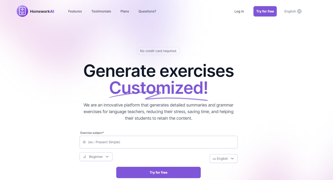 HomeworkAI es una plataforma en línea habilitada por Inteligencia Artificial (IA), diseñada especialmente para profesores de idiomas que enseñan inglés, español, italiano y otros idiomas. Su objetivo principal es automatizar la laboriosa tarea de crear materiales didácticos para las clases.